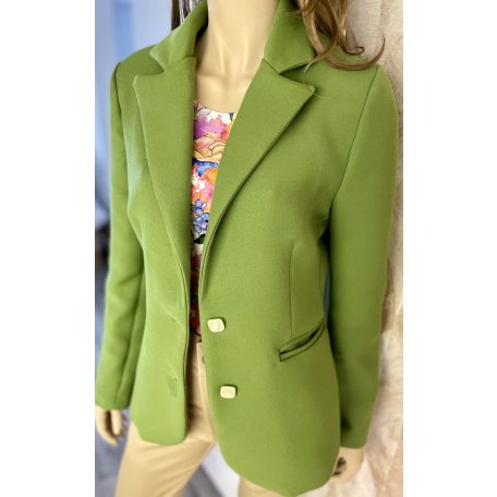 Gyönyörű zöld blézer, halványzöld viszkóz selyembéléssel, szögletes fényes halványzöld gombokkal. Nehezebb, vastagabb anyag, ezáltal melegebb is. Átmeneti időben optimális a viselése.