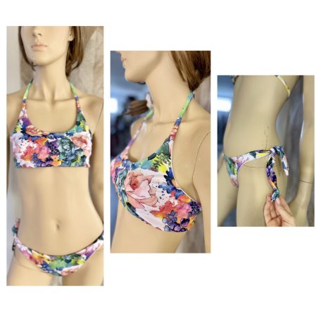 Virágos bikini felső, fehér béléssel, hátul kötős. Elöl, középen megköthető, vagy kötő nélkül is hordható, akkor top jellege lesz.