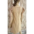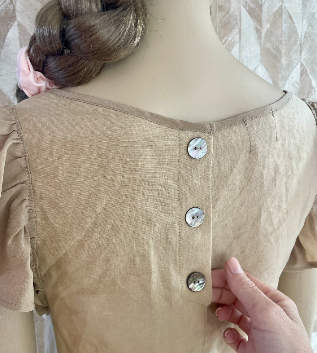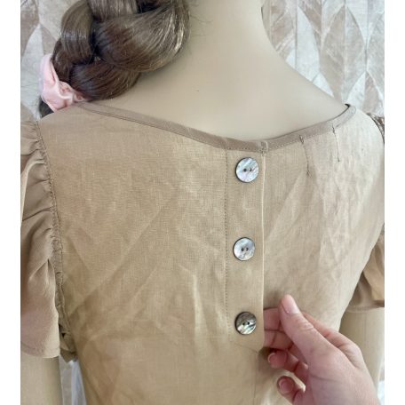 - kagylóhéj gombok: a hátoldalon végigfutó, kézzel válogatott valódi kagylóhéj gombok ékszerként ragyogják be a ruhát. Ez a természetes részlet teszi igazán egyedivé és kézműves jellegűvé a megjelenését.