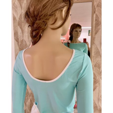 Gyönyörű türkz/menta színével biztosan elragadó leszel benne. Fényes gumi szegély díszíti a széleit, mely tökéletesen kiegészíti az anyag mattságát. Elöl csónaknyakú, hátul pedig kivágottabb.