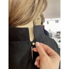 Magas minőségű, olasz santung selyemből készült állógalléros santung selyem felső, aminek a nyakrészét hátul egy tenyésztett gyöngy gomb, az ujját pedig egy 7 cm széles felsliccelt mandzsetta díszíti.