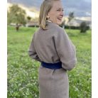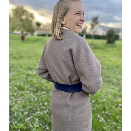 Szürke-kék 100% gyapjú külsejű pelerin, saját anyagából készült övvel, külső rátett zsebekkel. Különleges anyagú, hiszen dupla falú, mely ad egy tartást a gyapjúnak, illetve így szegni sem szükséges a széleit. Belső oldala kék színű, amely megjelenik a kihajtó részen, a zsebek tetején, és az ujjak végein egyedi megjelenést biztosítva viselőjének.