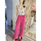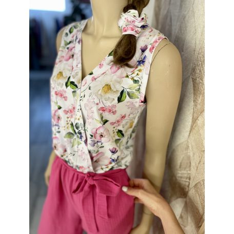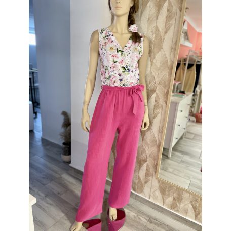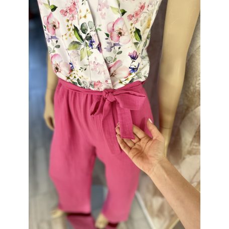Overál pamut jersey elasztikus virágos felső résszel és fukszia színű dupla géz nadrág résszel. A nadrág részre rejtett zsebet tettem.