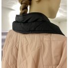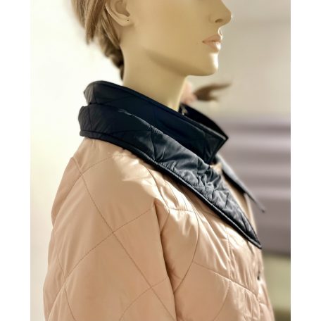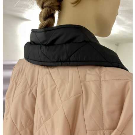 Púder-fekete egyedi kombinációjából született meg ez a steppelt kabát, melynek 3/4-es raglán ujja és a legtöbb testalkatnak előnyös lefelé bővülő szabása van. Kettő gallér közül az egyik hegyes, ami fix, a másik, az állógallér pedig tetszés szerint lepatentolható. Fekete patentokkal rögzíthető, így nem látszik akkor sem, ha épp anélkül viseljük.