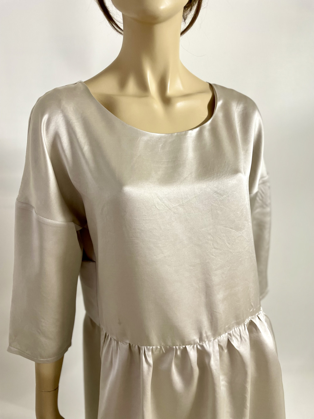 - modern szabásvonal: a bővebb, ejtett vállú felsőrész és a 3/4-es ujj modern csavart visz a klasszikus eleganciába.